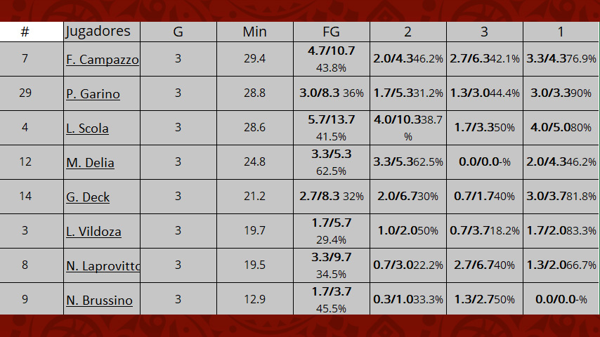 Básicamente este dato habla de que hoy Luis Scola y Facu Campazzo en un nivel superlativo y Patricio Garino dentro del terceto no pueden permanecer mucho tiempo fuera del campo, porque hoy la selección no encuentra modo de reemplazarlos. Para lograrlo deberá tener un crecimiento individual del resto que puedan aportar más de lo que vienen haciendo. Encontrar el lugar en la selección en un torneo corto, independientemente del proceso de la preparación, siempre es un problema para el jugador.
