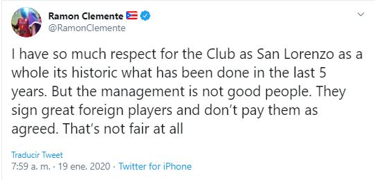Traducción: Tengo mucho respeto por el Club como por San Lorenzo en su conjunto y la historia que se ha hecho en los últimos 5 años. Pero la gestión no es buena gente. Firman grandes jugadores extranjeros y no les pagan según lo acordado. Eso no es justo en absoluto.